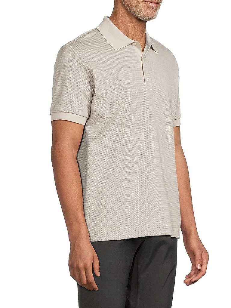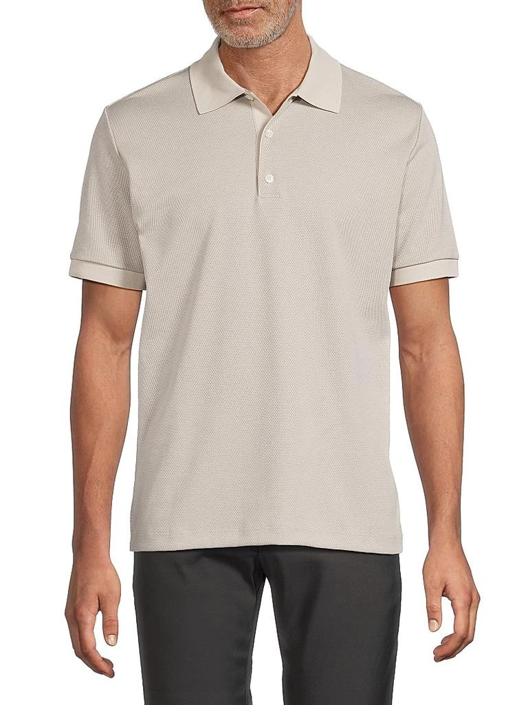 Theory’s Geo Polo is crafted of stretch jacquard pima cotton in a classic silhouette with a contrast collar and cuffs.